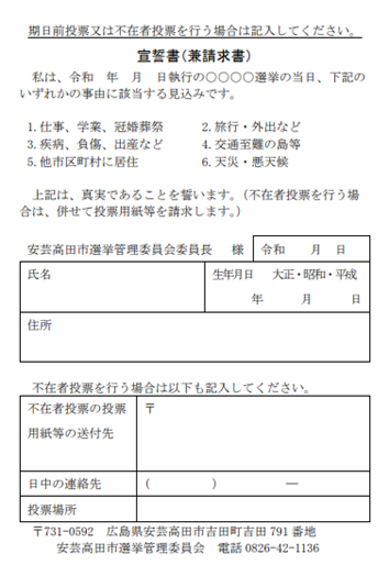 不在者投票を利用する方は、宣誓書に氏名、住所、送付先等を記入して安芸高田市選挙管理委員会へ直接お持ちいただくか、封筒に入れて郵送してください。