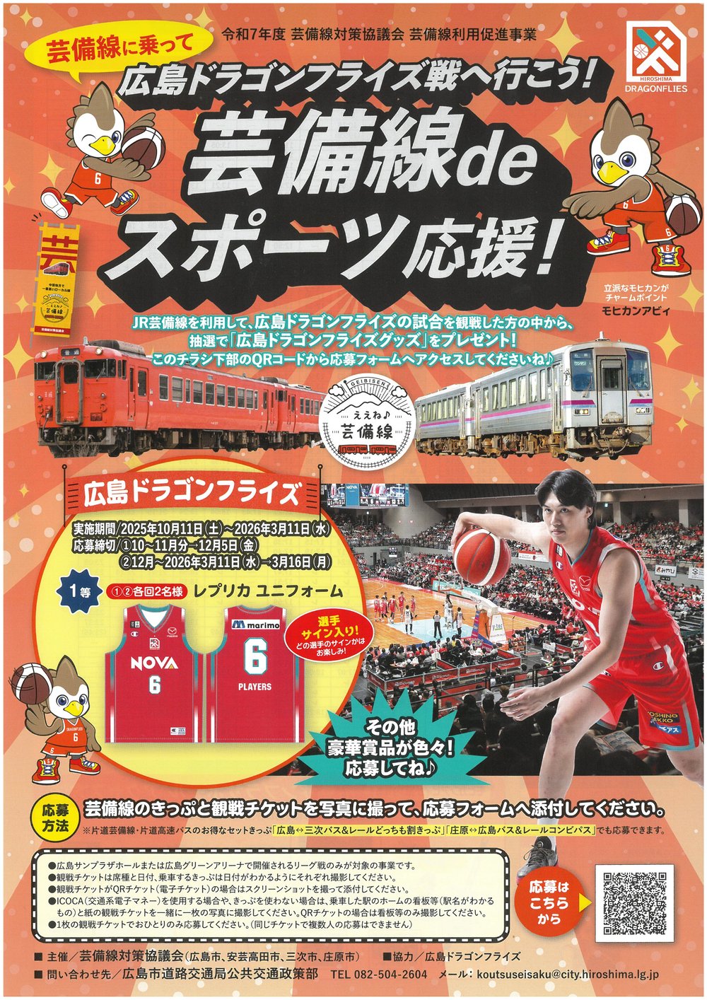 「芸備線対策協議会」の芸備線の利用促進イベントとして、芸備線を利用してカープの試合か、サンフレッチェやレジーナの試合、広島ドラゴンフライズの試合を観戦をした方の中から、応募抽選で「カープグッズ」か「サンフレッチェグッズ」、「広島ドラゴンフライズグッズ」をプレゼントします。