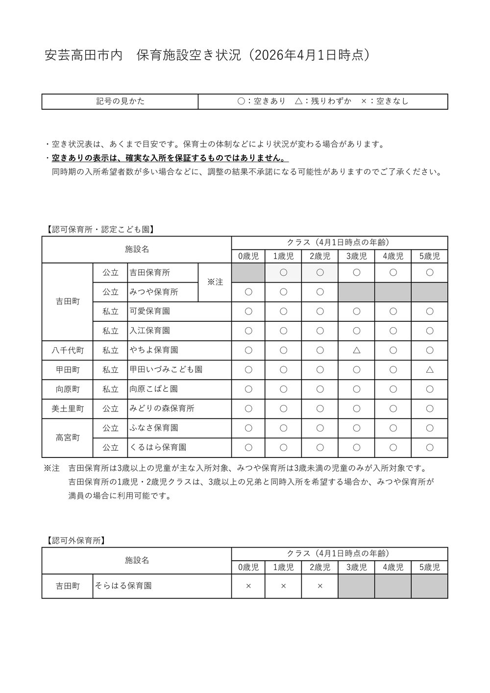 安芸高田市内の保育所・認定こども園の空き状況(2026年度入所)をお知らせします。