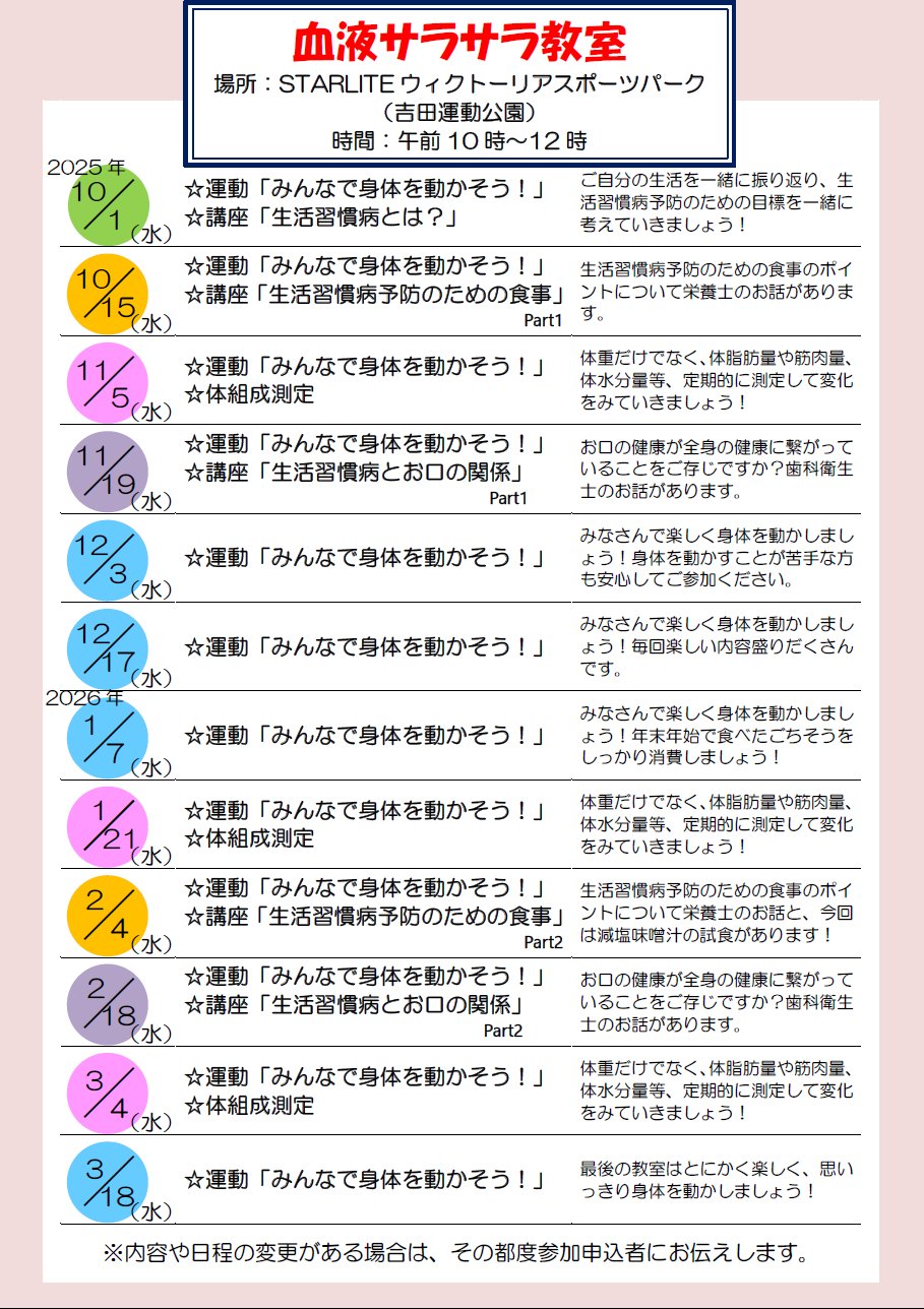 10月から始まる血液サラサラ教室に参加して取り組むコースです。参加できる日は1日でもあれば参加できます。毎回楽しい運動や、減塩味噌汁の試食等、楽しい内容盛りだくさんの教室です。1人で取り組むのはなかなか続かないという方、他の参加者とワイワイ楽しく取り組みたい方にオススメのコースです。