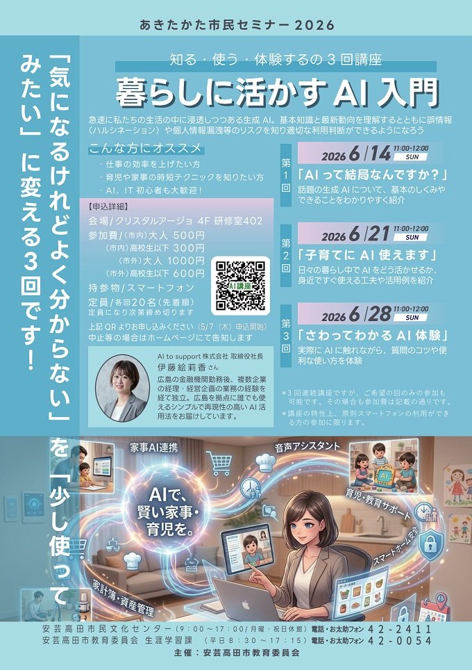 第2回 2026年6月21日 日曜日 11時00分から12時00分 「子育てにAI使えます」