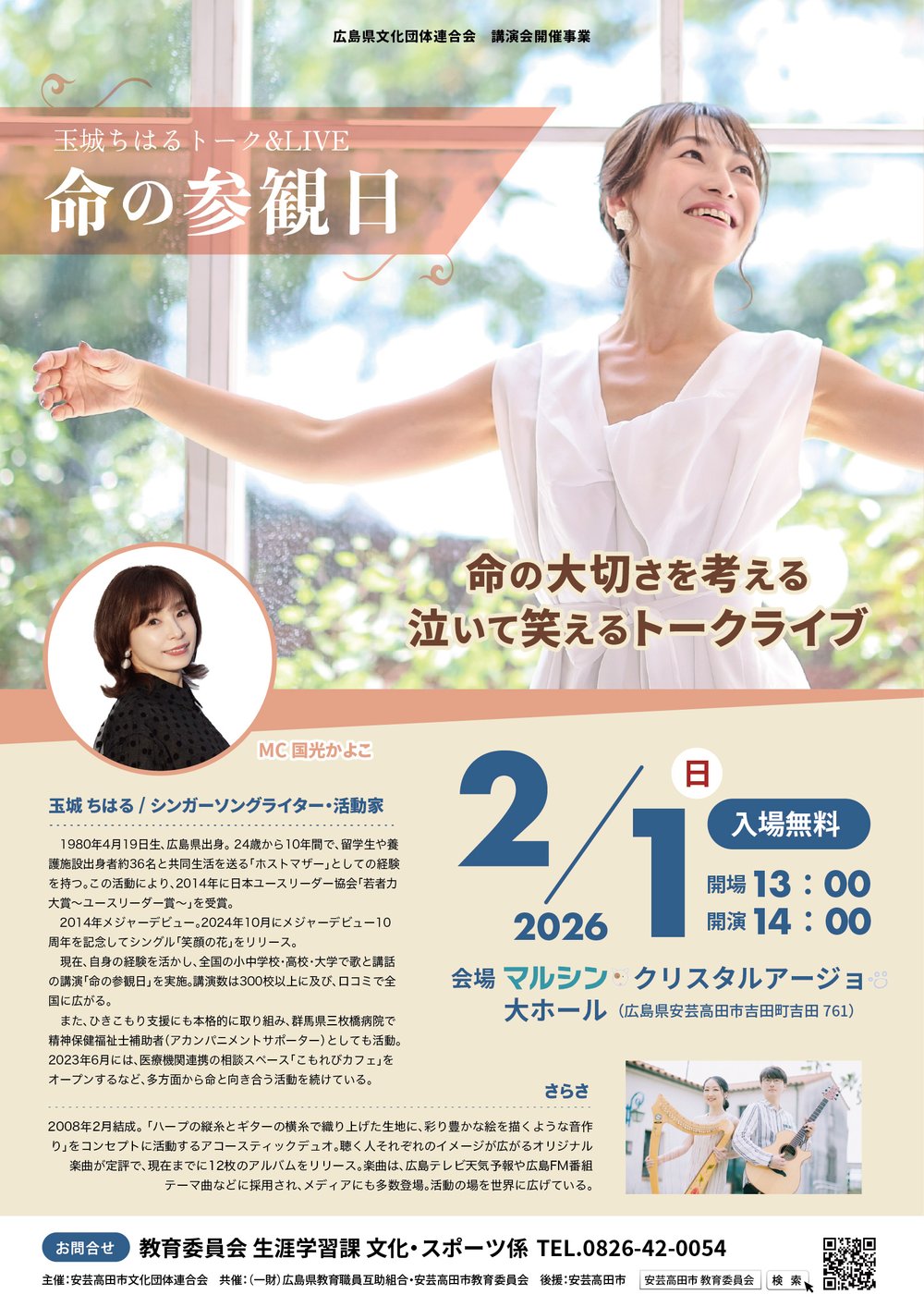 【2026.2.1】第44回広島県文化団体連合会文化講演会 玉城ちはるトーク&LIVE「命の参観日」開催