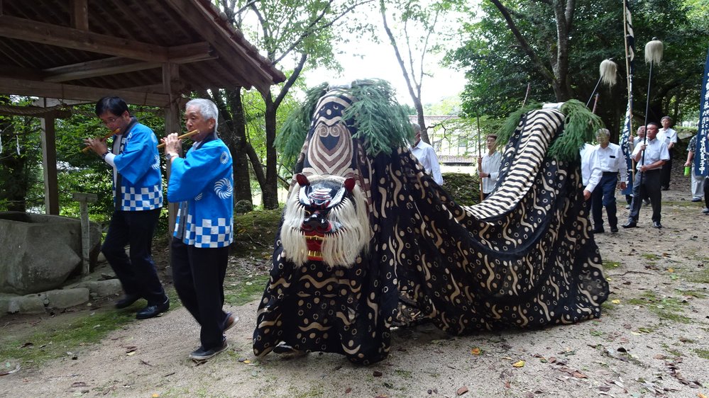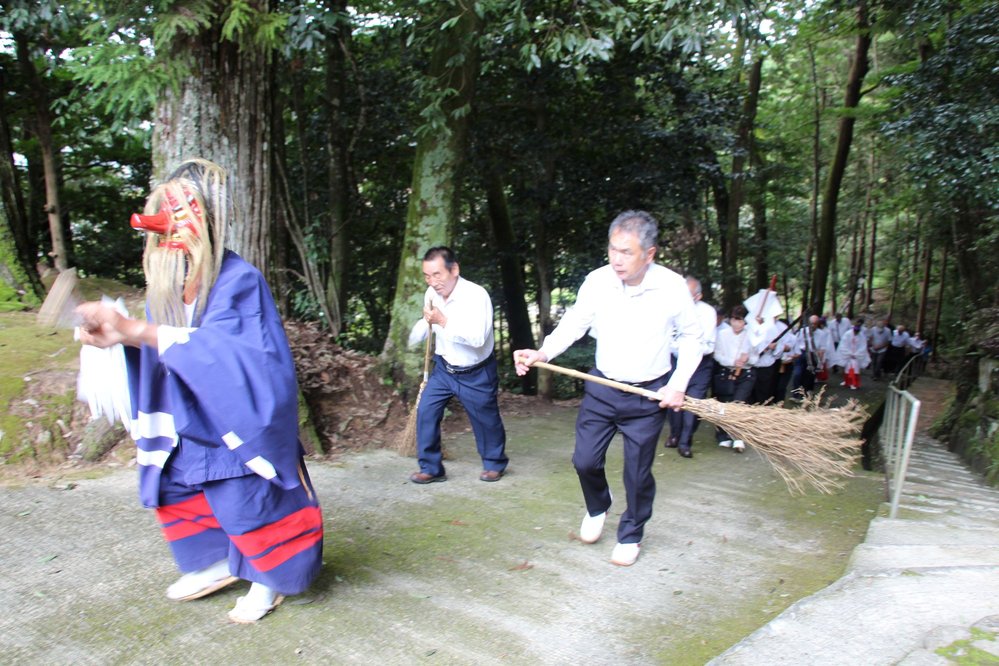 9月中旬の秋祭りの午後から行われる神儀は「神幸式(じんこうしき)(*1)」のことを意味する方言で、氏子中が8組に分かれて年番で奉納する祭礼です。神儀は舞殿での猿田彦と獅子舞による悪魔祓いにはじまり、ついで露祓い(箒)を先頭に榊・猿田彦・獅子頭・神馬・供物・御輿・随神・神官・氏子総代・囃方・氏子などが行列を整えて本殿前を出発し、太鼓をたたき、笛をふきながら境内の東の道から西の道をめぐり、本殿前まで帰って終了します。