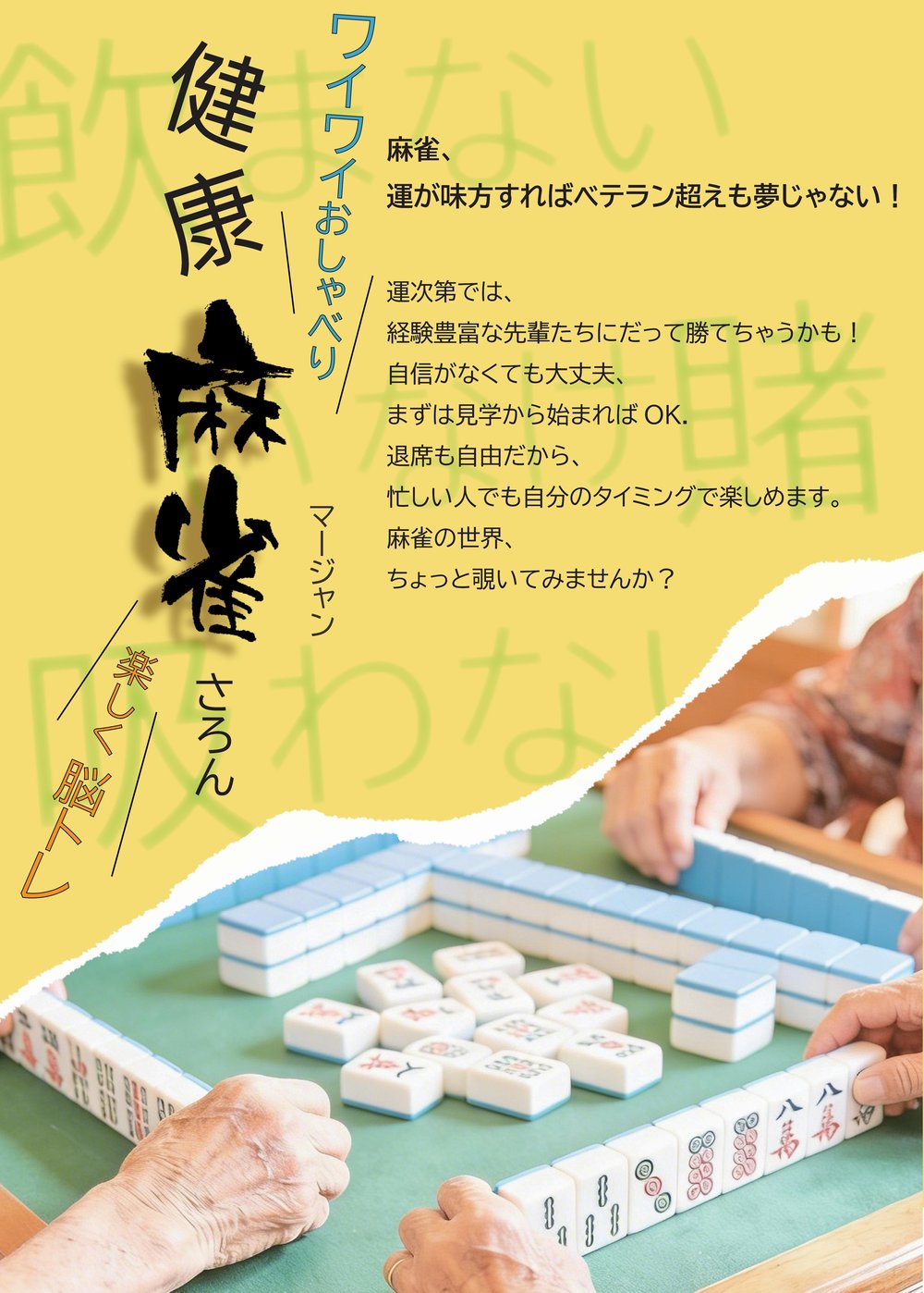 「健康麻雀」とは、「飲まない・吸わない・賭けない」をルールとした、健全な頭脳スポーツです。