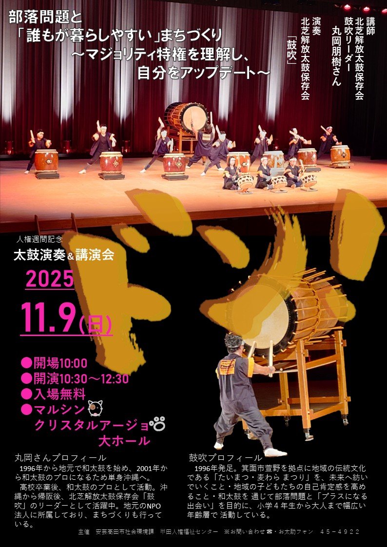 安芸高田市では、人権週間に向け「和太鼓の演奏会」と「人権講演会」を開催します。
